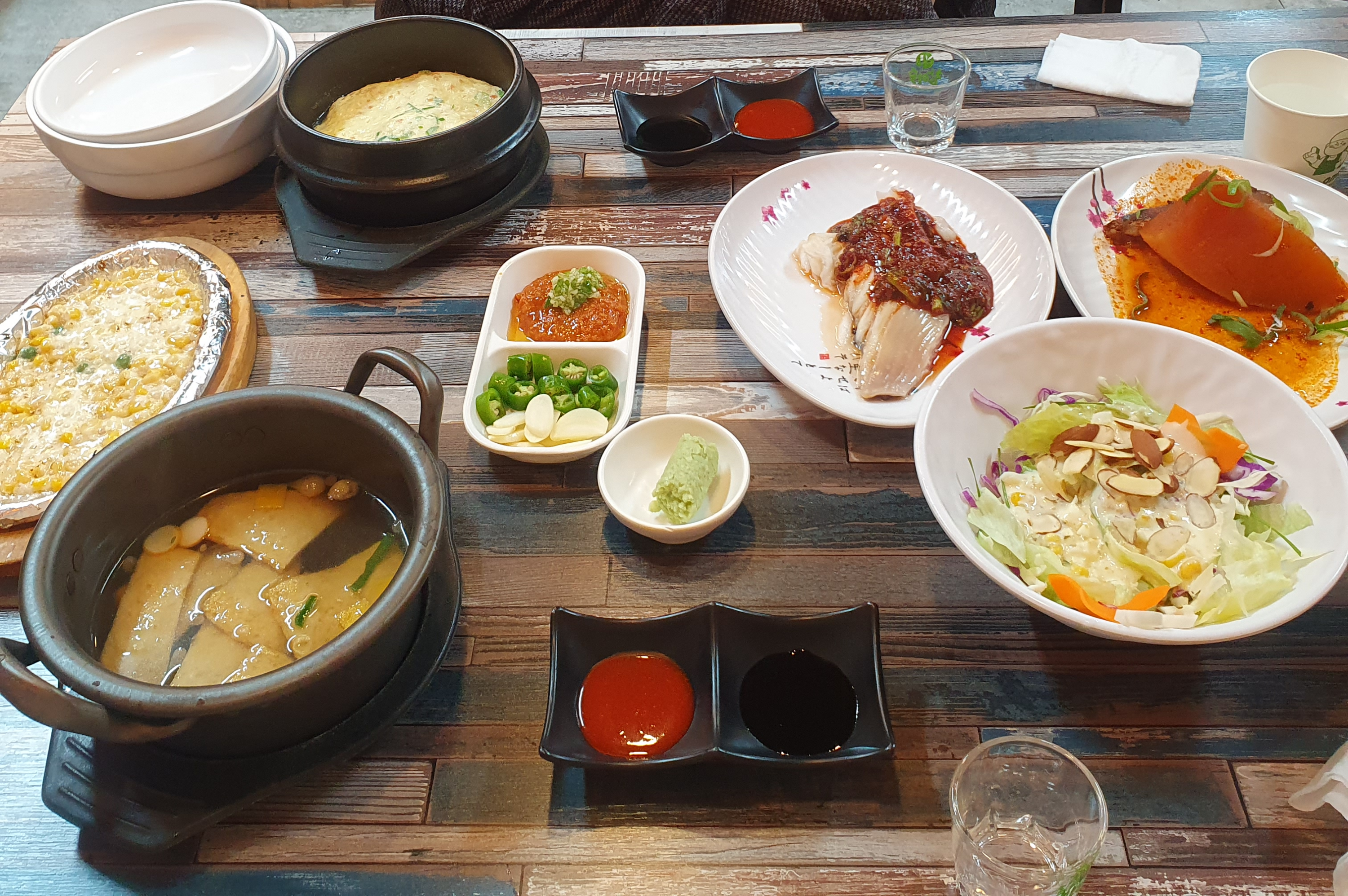 어묵탕, 콘치즈, 샐러드, 꽁치무조림, 가오리찜, 계란찜