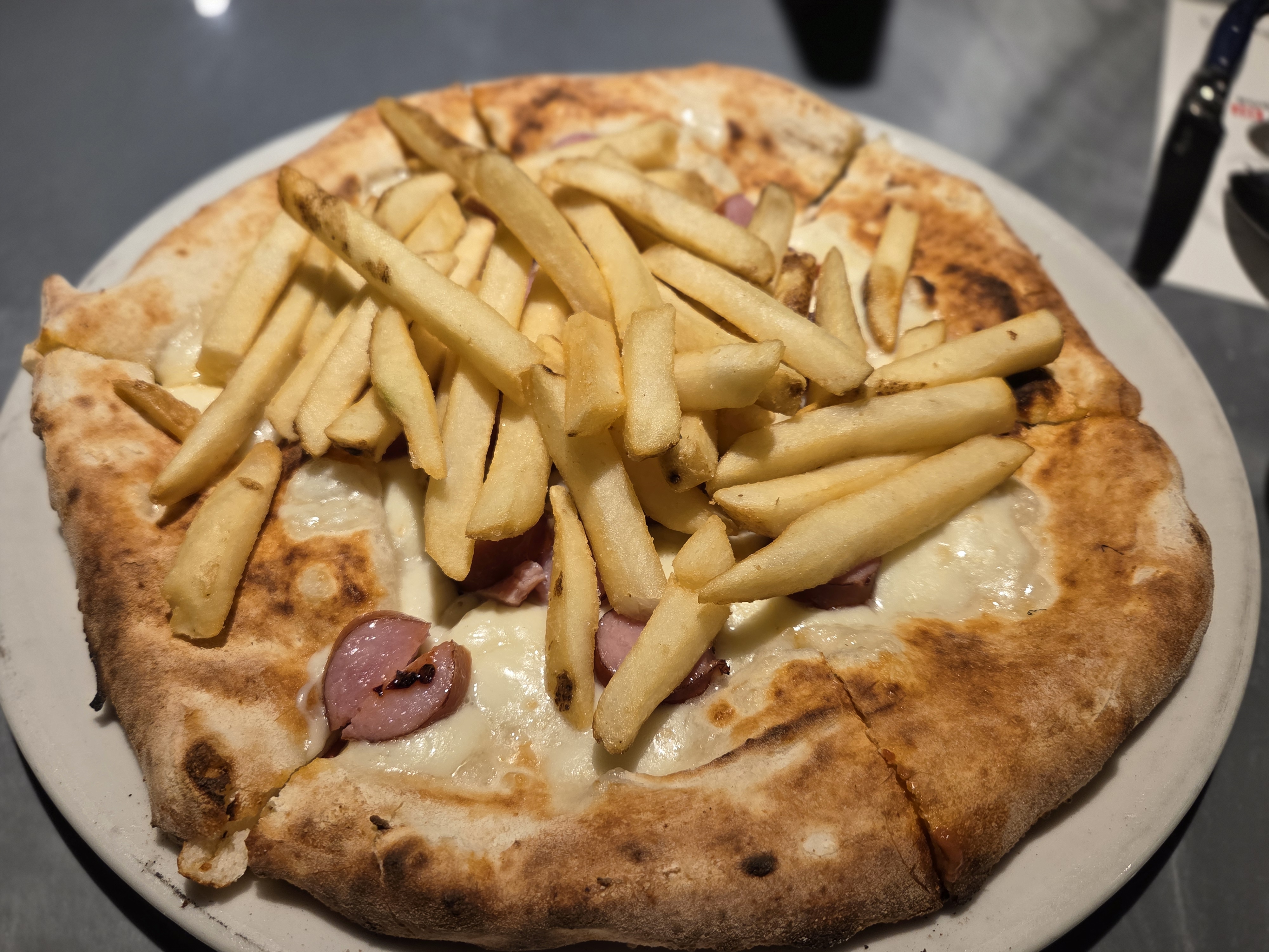 감자튀김과 돼지고기로 만든 소세지가 올려진 피자