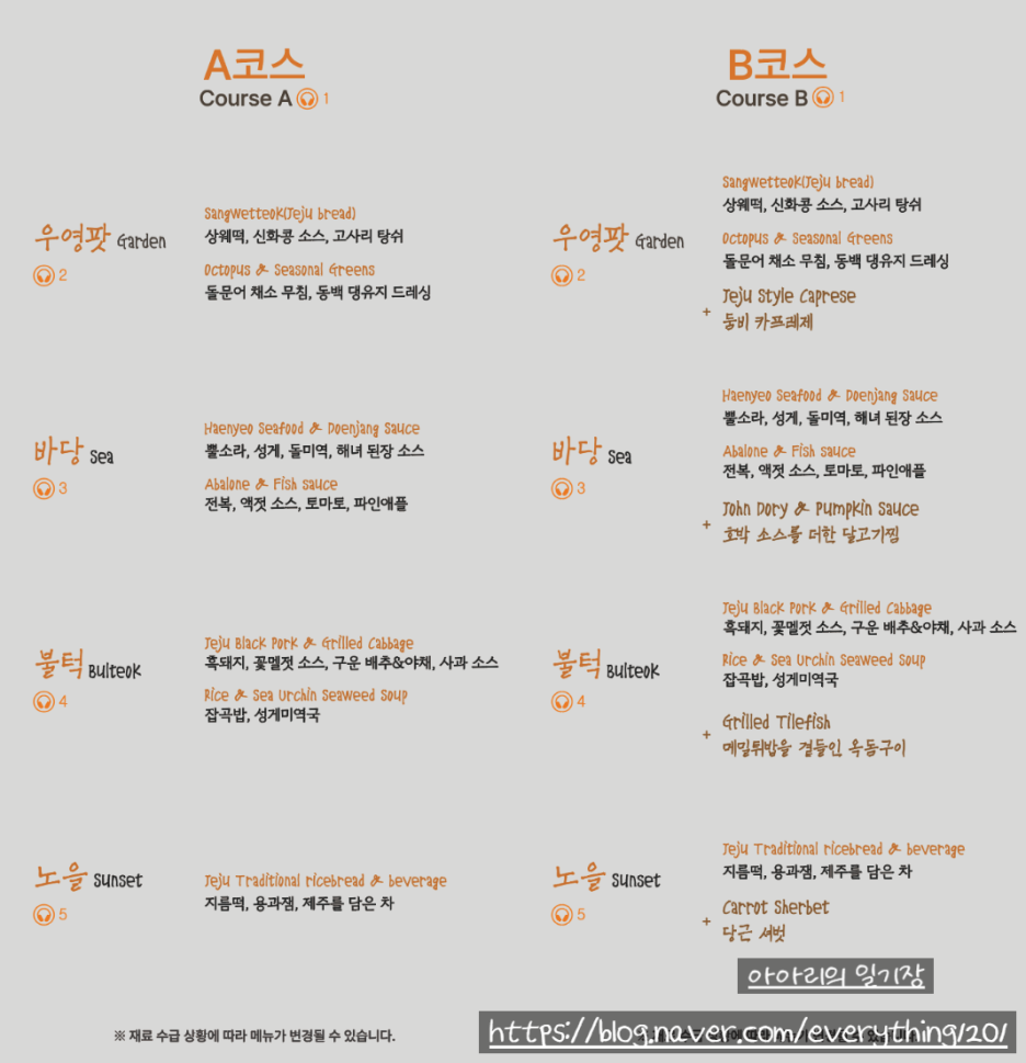코스는 두가지가 있고 B코스는 A코스+4가지 음식이 추가돼요