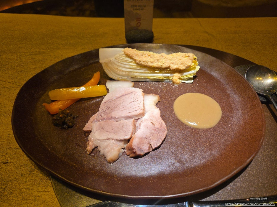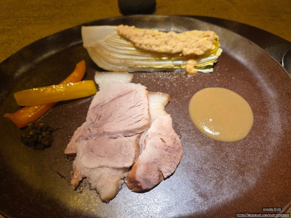 흑돼지, 꼴멜젓 소스, 구운 배추& 야채, 사과 소스