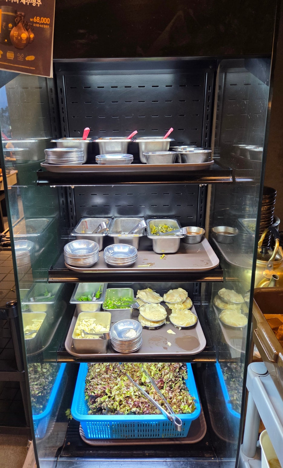멜젓과 갈치속젓, 명란, 와사비, 백김치가 불판 옆에 셋팅
