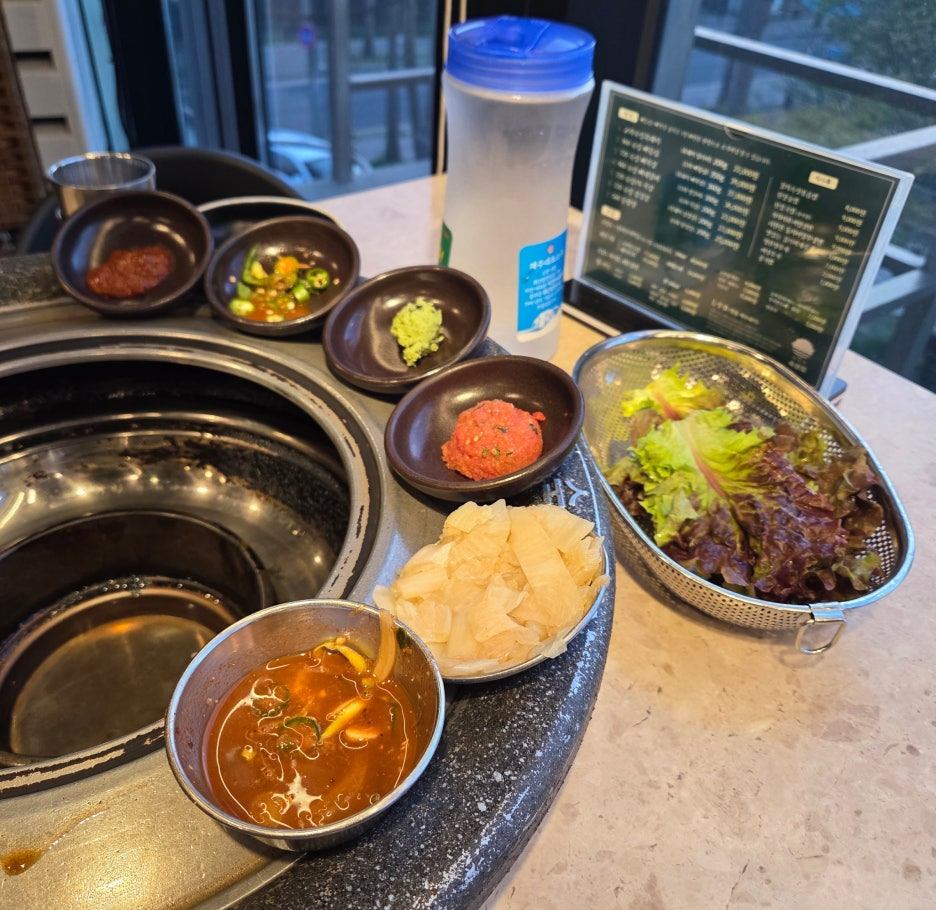 멜젓과 갈치속젓, 명란, 와사비, 백김치가 불판 옆에 셋팅
